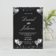 This elegant "Save the Date" card design for a wedding on Zazzle features a sparkling black backdrop symbolising a night sky, adorned with shining stars and floating silver hearts that add a romantic and celebratory touch. The names "Daniel" and "Juliana" are written in a stylish white cursive font, creating a focal point that stands out against the dark background, signifying the couple's union. Centred between the names are two silver rings intertwined, representing the couple's bond and the promise of marriage. The details of the wedding are provided in a clear and concise white font, making the information easily readable against the dark background. The overall design is both modern and timeless, perfect for announcing a special occasion that friends and family will want to remember