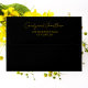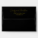 Solid black coloured mailing envelope for your wedding invitations and features your name and address printed on back flap in a modern script style in a gold colour. Personalise your envelope by editing and replacing name and address with your own. Edit further to change font style or colour. Select your envelope size that fits your invitation.