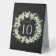 A black tented sign for christmas/holiday party table numbers, featuring hand painted snowberries and eucalyptus arranged into a beautiful botanical wreath. All text is fully editable. Other designs, table number products and coordinating items are available in my store.