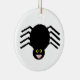 This fun pendant style ornament features a spooky black spider with eight hairy legs, yellow eyes with big black pupils and its mouth open showing its fangs. There is customizable text on the back of the ornament that reads "I love spiders"