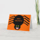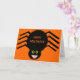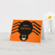 A spooky black spider with eight hairy legs, yellow eyes with big black pupils and its mouth open showing its fangs. This scary spider Halloween card has an orange background.