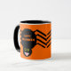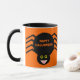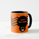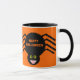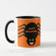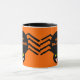 this halloween coffee mug features a spooky black spider with eight hairy legs, yellow eyes with big black pupils and its mouth open showing its fangs.The background is orange with a black border. There is orange text on the back of the spider that says "Happy Halloween". There is a spider on each side of the mug. The mug is a black and white ringer style mug but the design is available on a wide range of different styles and colours of mugs.