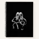 This is a black spiral notebook. It has a black-and-white pointe shoe design on its front cover.