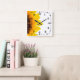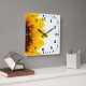 Clock with a black square clock face on a background with a yellow and brown sunflower on white. Customisable. Modern and trendy, yet classic, this clock is perfect for any decor.