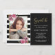 This black and white striped sweet 16 birthday invitation also features some watercolor raspberry colored floral arrangements. The heading is in a faux gold foil finish. The photo appears on the left hand side of the design in a faux gold foil border frame. More designs in this color scheme are available at the store. This balck white striped and floral sweet 16 birthday invitation is ready to be personalized.