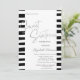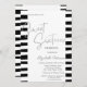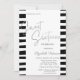 A modern, chic and glamourous silver script Sweet 16 on a black white striped background.