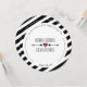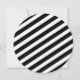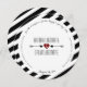 A round wedding invitation featuring a background of black and white stripes. Personalise the black text around the edges with details of your occasion. Personalise with bride and groom's names at centre with red heart and arrows.