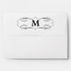 This is your basic white invitation envelope with a solid dramatic black interior. The back flap has an added attraction, a distinguished black swirl frame with your monogram. This formal envelope works well with any 5 x 7 or smaller invitation. To see other sizes available, choose "Customise". You may also use that option to change the outside colour of the envelope from white to a variety of colours, or change the font, location, size, or colour of the monogram.