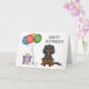 Cute birthday theme design featuring Destei's original cartoon illustration of a cute black and tan colour Cavalier King Charles Spaniel breed dog. Next to the dog there are colourful birthday balloons tied on a dog bone and a purple and yellow colour present box. The background has a playful pattern of colourful pastel confetti on a white background. There is also a personalizable text area that now reads: "Happy birthday!".