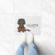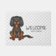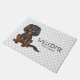 Destei's original cartoon illustration of a cute black and tan colour Cavalier King Charles Spaniel breed dog who is sitting. There is also text that now reads "Welcome" together with a personalizable text area for a family name or other custom text. The background has a pattern of grey paw prints.