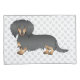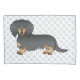 Destei's original cartoon illustration of a cute long hair black and tan coat colour Dachshund breed dog. The background has a pattern of grey dog paw prints.