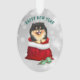 An adorable little black and tan Pomeranian pops out of a red gift bag on the front of this Christmas ornament. A few teal and gold pattern Holiday tree bulbs lay just in front of the Santa bag.The text above the image says "MERRY CHRISTMAS" in red. The image and text are placed on a silver abstract bokeh background. The back of the ornament has the same image, but with the text "HAPPY NEW YEAR" in teal green.