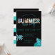Celebrate the end of summer in style with this chic, minimalist, black and teal beach party invitation. The card features the word summer in bold typography filled with beach-themed photographs on a black background. The turquoise palm tree and tropical greenery illustrations complement the minimalist style. The back of the card features black white and teal stripes. Add your party details to the invitation and send it off to your friends and family.