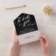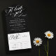 Elegant goth all in one wedding invitation in black and white with swirly calligraphy,. An elegant wedding invitation for a Halloween wedding, goth wedding, or similar.