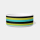 Horizontal stripes in black, turquoise blue - green, and a greeny - yellow colour. Has a funky retro look. Simple striped design.