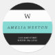 Monogrammed return address label in black, white, and turquoise featuring broad stripes and an elegant font.