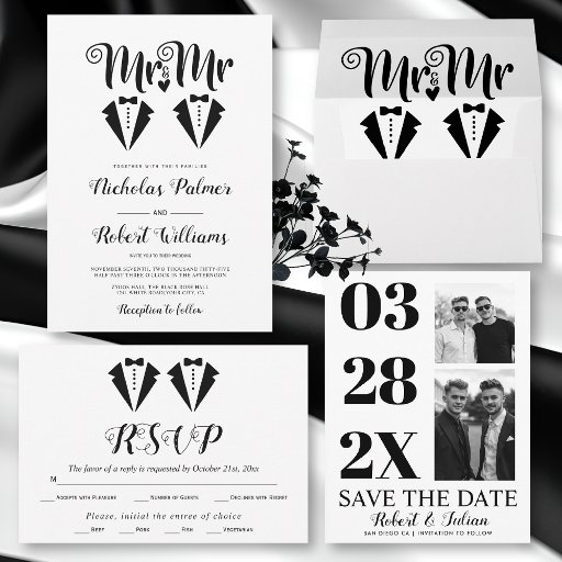 Black and white tuxedo Mr and Mr two grooms gay wedding Invitation. This elegant wedding invitation features a sophisticated black and white design, specifically tailored for a Mr & Mr gay wedding. The primary visual element thoughtfully showcases the upper portion of two gentlemen's formal suits, complete with distinguished bow ties, indicating the attire of the two grooms. Prominently displayed alongside this illustration, the celebratory title "Mr & Mr" is beautifully rendered in a flowing script typography. This clear and cohesive design effectively conveys the joyous union and the formal, yet personal, tone of the event.