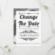 Vintage elements and black and white typography wedding Change the Date postponement announcement. This elegant wedding design displays the text "Change the Date" in bold black typography and vintage elements that form frames for the text. The back features a photo of the couple.