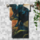 Black unicorn on a cliff edge up in its hind legs. colourful sunset in behind.