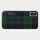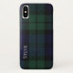 Handsome iPhone X case done in the dark blue and green Black Watch tartan plaid. Personalise the white text, running down the left side, for yourself or as a great gift idea. Stylish way to protect your electronic device.