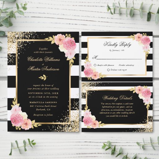 Elegant black and white striped floral seating chart for 12 tables featuring blush pink flowers and gilded greenery. Matching items available.