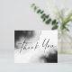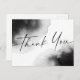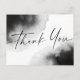 Thank you postcard featuring the text "thank you" across the card in an elegant handwritten style script font on a background with black and grey watercolor splashes