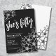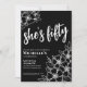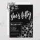 Floral Fifty Black White 50th Birthday Party Invitation. A fun but elegant 50th birthday party invitation with black and white flowers for the young at heart. A playful flower pattern frames a script typography "she's fifty" mixed with a more classic serif font. Celebrate fifty years of life with this beautiful botanical design. The fun part is you can change out ALL of the colours!! You can not only change the background colours and font, but you can change the lines for the flowers as well.