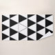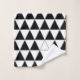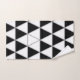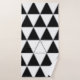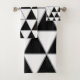 A bath towel set decorated with a geometric triangle pattern in black, white and grey. The rhythm is broken by one triangle in in white.