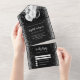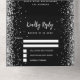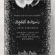 A black background, decorated white balloons, with white and faux silver glitter sparkles on the inside.  Personalise and add names, party details, RSVP date, return address and name.
