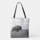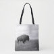 Original black and white photograph of an American Bison Bull standing on the side of a hill printed on a cute tote! The photograph was taken in Yellowstone National Park in the summer of 2022 while motorcycle touring the area. A BohippianFinch original photograph.
