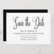 Elegant and timeless black and white design. Save the Date is written in beautiful script text. Your names, wedding date, and location follow. You can include an additional message on the back.
