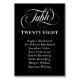 Elegant black table cards with elegant fonts, table in a swirly calligraphy script and the table number and the names of your wedding guests seated at that table in classic fonts. Black wedding table cards printed with the guests seated at that table in white fonts. Add a touch of elegance to your wedding with these black and white table cards personalised with your guests' names. Add the list of guest names seated at the table to these elegant wedding table cards in black and white.