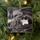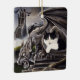 Black and white tuxedo kitten is sitting beside a gargoyle. Behind them is a castle and dragons.