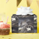 A black and white Tuxedo kitten is sitting with a gargoyle. Behind them is a gothic castle and dragons.
