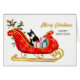 On this Holiday card, a black and white cat sits in a pretty red and gold decorative sleigh. Beside the cat are gift packages tied with colourful bows, and behind the sleigh is holly with red berries. The gold script text at the right says "MERRY CHRISTMAS" and your custom text is in green. All the text, inside and out, may be easily changed to anything you'd like. There are more cat AND dog images and products at Dog Village.