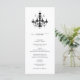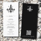 A minimalist black and white chandelier monogram wedding design. A simple design that uses a hand drawn silhouette of a chandelier to create an elegant classic monogram. A charming black and white chandelier design with elegant and classy script typography. An elegant chandelier themed wedding menu card design with modern QR Code, to allow your guest to view the menu digitally. Matching wedding invitations and other stationery items are also available.