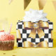 An elegant combination of Black and White chequerboard with a Gold Pearl Bow Ribbon. The Pearl is white.