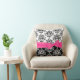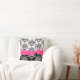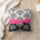 Lovely damask print decorator throw pillow done in black and white. Graphic printing of a pink ribbon and bow, stretches across the middle front of the pillow. Elegant pillow for any room of the house or office.