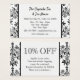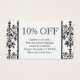 An elegant custom salon, coffee house or restaurant business discount card with script and serif letters for your address and information on an elegant black damask pattern on white, and larger letters on the back for your discount information.