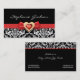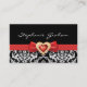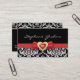 Black white damask pattern with red bow and jewel business card template that features a black and white damask pattern and a red ribbon across it with a bow and a heart shaped jewel also in red with gold outline and strass which adds a little bling. Note the bow and the heart diamond jewellery is a "printed on" illustration and not a real crystal, so are the strass. An elegant and stylish feminine business card design. Trendy, fashionable and modern perfect for professional or personal use.