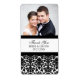 Elegant Wedding thank you custom photo template labels in stylish and chic black and white with classic and romantic floral vintage damask pattern, the perfect addition to your wedding, available in a wide selection of matching wedding products. Perfect for wedding favours or wedding wine bottle labels.