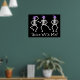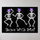 These dancing skeletons make a great Halloween poster. Fun to hang on the door or walls for parties or trick or treaters. Three skeletons are dancing a jig on a black background with the customisable words "Dance With Me". You can customise to your own saying or personalise with a name. The hand painted original art features dancing skeletons with purple top hat on their skulls and is in the colours black and white with purple. Check for my other products with this art for goulish products for Halloween including invitations, greeting cards, tee shirts, electronic cases and more. Fully customisable for personalisation. The original art is from Phyllis Dobbs who wishes you a happy and ghoulish Halloween.