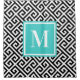 A classic black and white diagonal Greek key maze pattern with a medium turquoise and white single letter monogram.