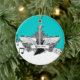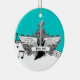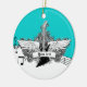 Black white electric guitar with wings keepsake ornament, featuring an electric guitar, wings, flames and swirls on music pentagram, notes and treble clef on turquoise background. A great gift for a musician, guitar player or lover.