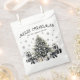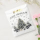 At the bottom of the design is the detailed artwork—a black and white Christmas tree with a soft green tint, surrounded by wrapped presents and delicate falling snowflakes. The clean watercolor style and minimalist layout make this favour bag a stylish and timeless way to package holiday treats, small gifts, or party favours.