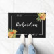 Black & White Fall Foliage Doormat: Welcome guests with understated elegance using this minimalist personalised doormat, featuring your family name or a custom message in an elegant white script. The personalisation is beautifully framed within a sleek white border set against a bold black background. Clusters of watercolor fall leaves in warm autumn hues, such as burnt orange, golden yellow, and rich red, gracefully overlap the frame in the upper right and lower left corners, adding a subtle yet inviting seasonal touch. Perfect for adding a chic, fall-inspired statement to your entryway, this modern fall doormat combines clean lines and nature's beauty, offering a stylish and sophisticated welcome to your home.