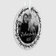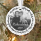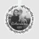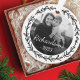 Modern festive black and white wreath family photo ornament design. The design features our hand-drawn festive black and white leaf wreath frame add your own personalised family photo, name and year. Design by Moodthology Papery.
