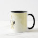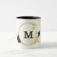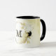 Beautiful coffee mug featuring black and white flowers and gold leaves .