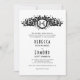 Black, white floral heraldic crest wedding invitation. It showcases a heralded crest with flowers and pomegranates and your initials or monogram. The back includes a polka dot black and white pattern.