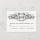 Black and white floral heraldic crest wedding RSVP response card. It showcases a heralded crest with flowers. The back includes a black and white polka dot pattern.